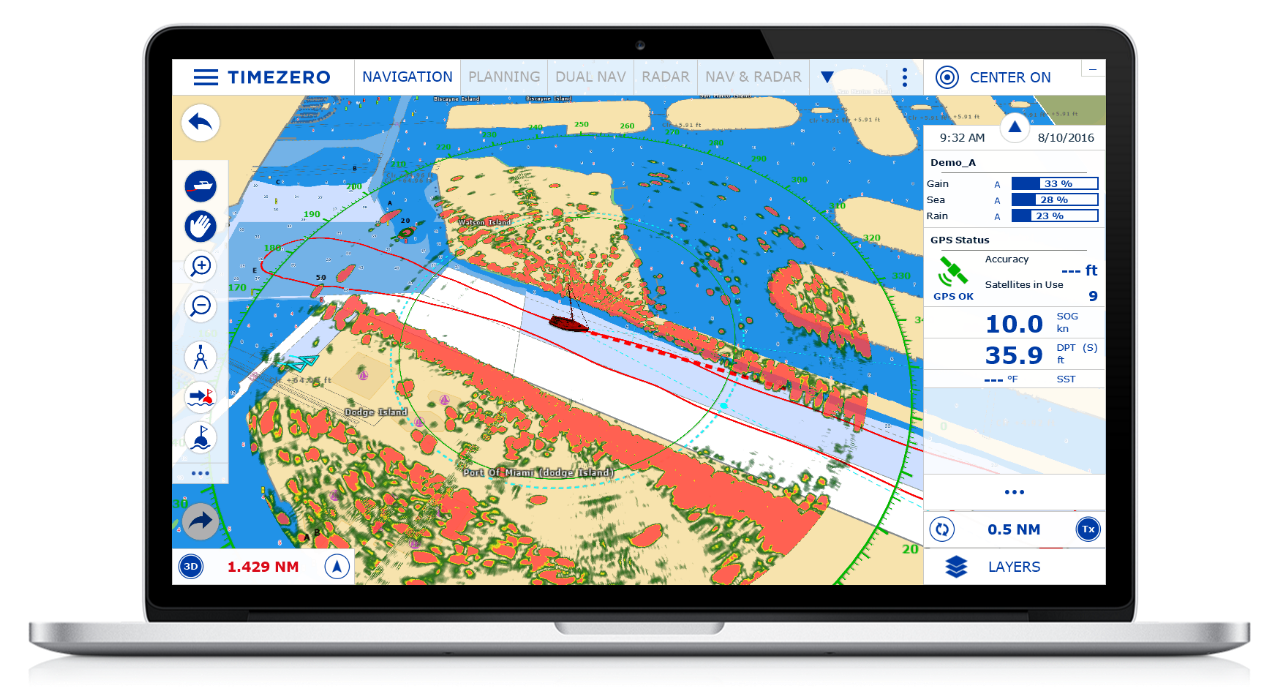 Thanks to our partnership with FURUNO, the world’s leading marine electronics manufacturer, TIMEZERO software offers exclusive, native compatibility (simple Ethernet connection) with all the FURUNO DRS antennas as well as the commercial series of FURUNO FAR radars. The radar image can be overlaid directly on the chart in order to have a better understanding of the data. TIMEZERO offers the ability to take full control of the radar directly from a dedicated workspace (Gain, Seaclutter, Rainclutter, etc.).